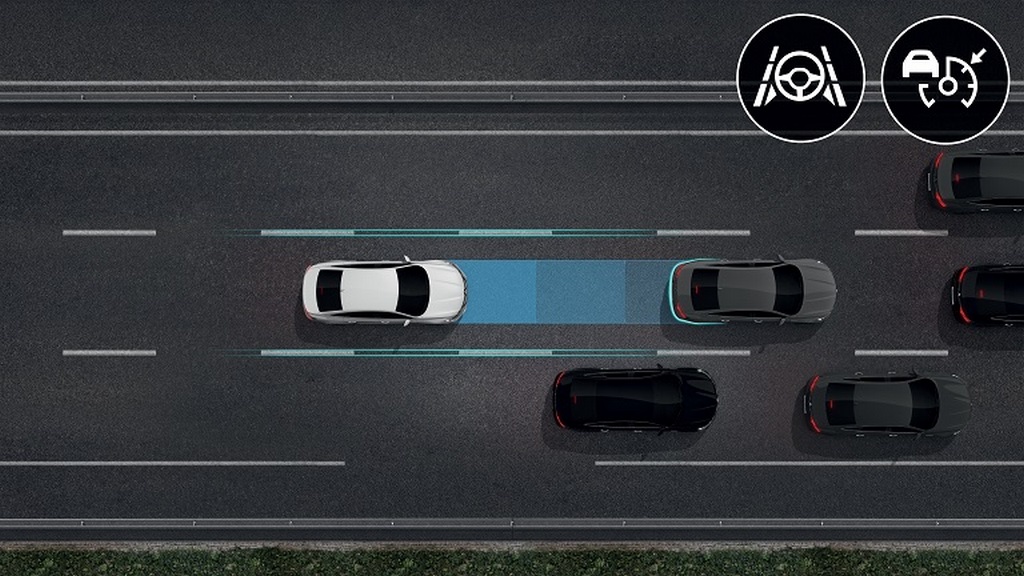 Asystent jazdy po autostradzie i w korkach łączy dwa systemy wspomagające kierowcę: aktywny regulator prędkości oraz funkcję utrzymywania samochodu w osi pasa ruchu, nawet podczas pokonywania zakrętów.