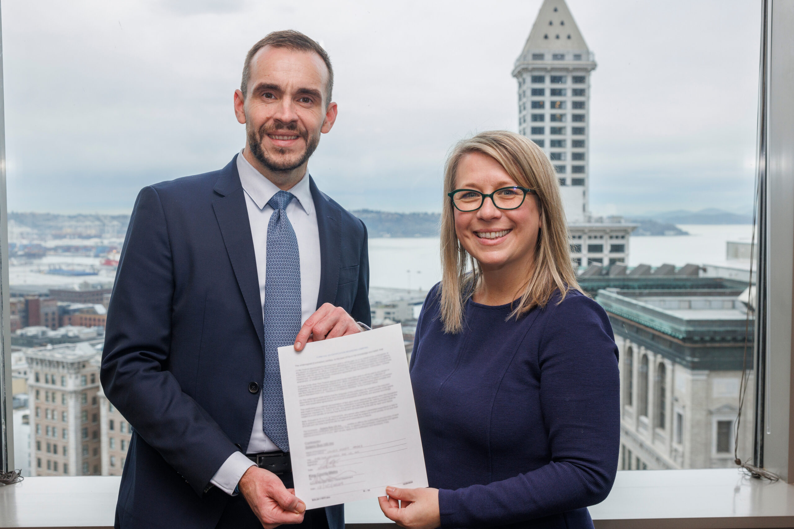 Na zdjęciu: Michelle Allison, Dyrektor Generalna King County Metro i Javier Iriarte, Prezes Zarządu Solaris Bus & Coach. Zdjęcie dzięki uprzejmości King County Metro.